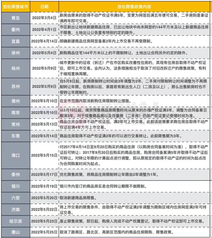 为稳定房地产市场,近期各地不断出台楼市扶持政策,越来越多的城市对限售政策进行了调整。 分城市来看,唐山、哈尔滨、银川、德州、六安、宜昌等城市直接取消了限售政策;苏州、常州、东莞、泰州等城市缩短了限售年限;青岛、南京、海口、济南则对转让年限的计算起点进行调整,即从取得不动产证的时间算起,改为网签或合同备案时间算起。 值得关注的是,部分城市放松限售后,二手房挂牌量激增。 “从政策显效性上,基本面较好、需求较旺盛的城市随着挂牌量改善,有助于需求释放;而调整压力较大的城市,由于购房者置业预期较弱,居民消费更趋理性,大量二手房入市会加大市场供过于求的状态。”中指研究院指数事业部市场研究总监陈文静告诉记者。 放松限售后挂牌量激增 河北唐山于5月25日宣布,对部分房地产调控政策进行梳理清理和优化调整,其中包括取消路南区、路北区、高新区范围内的商品住房限售政策。按此前规定,购房人在上述区域内购买新建商品住房,自网签之日起42个月内不得上市交易。 不只是唐山,据中指院统计,截至5月25日,已有20城取消限售或缩短限售年限。